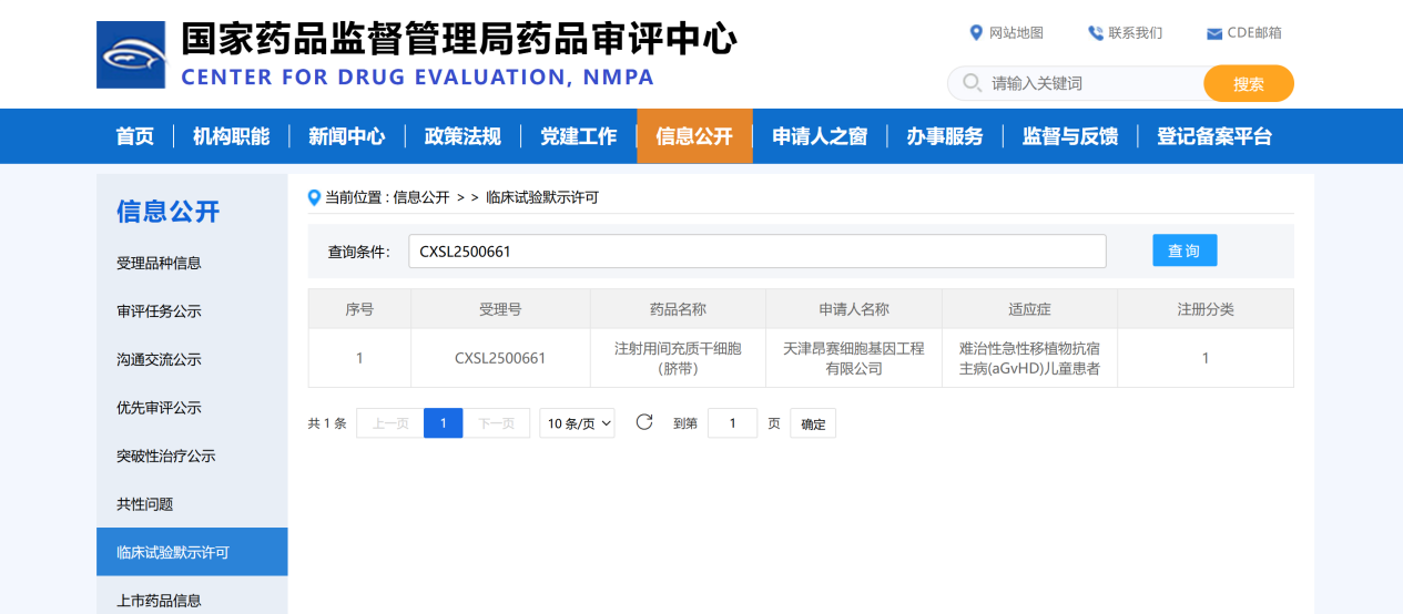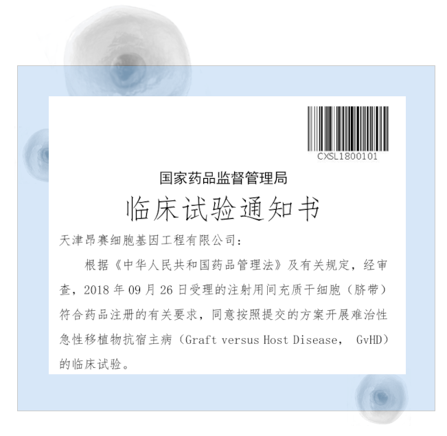 2025年11月3日, 天津昂賽細(xì)胞基因工程有限公司申報的注射用間充質(zhì)干細(xì)胞(臍帶)治療難治性急性移植物抗宿主?。╝GvHD)兒童患者的適應(yīng)癥獲得國家藥品監(jiān)督管理局臨床試驗?zāi)驹S可